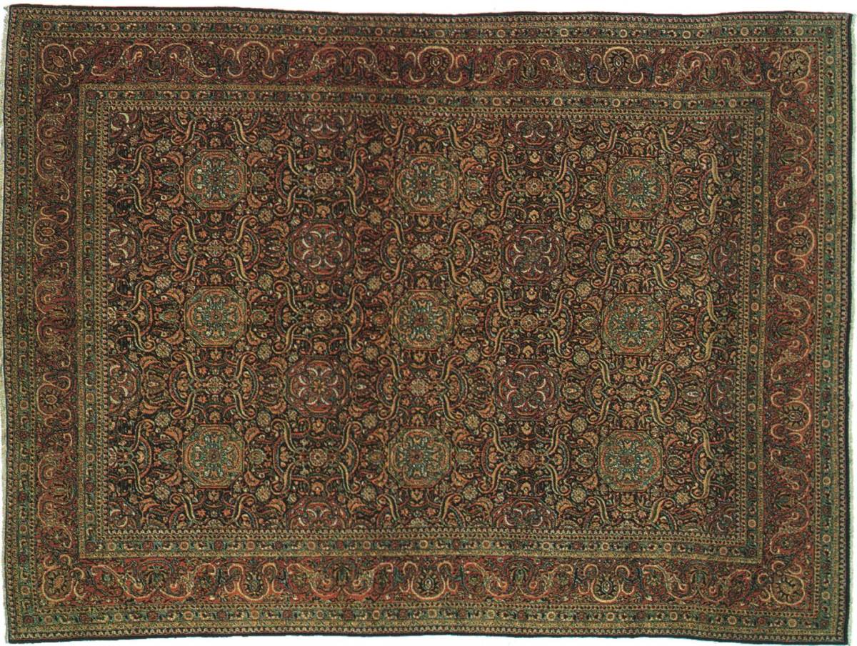 Très beau TAPIS KECHAN, Iran, fond bleu marine à caissons turquoise et brique, enrichi de guirlandes de fleurs. Belle bordure brique à arabesques. Tissé vers 1930.