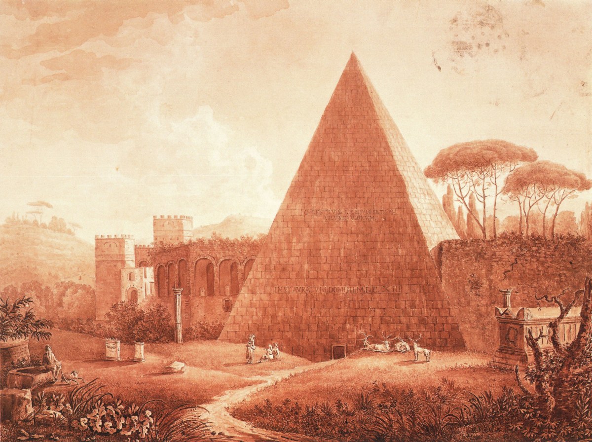 « C'est une pyramide à quatre faces, toute de marbre, avec une inscription du côté de Rome et du côté de la campagne. On pénètre dans l'intérieur par une porte basse à laquelle aboutit un corridor bas et obscur d'environ vingt pas, au bout duquel est la chambre sépulcrale, de la forme d'un carré long. Dans cette chambre était l'urne sépulcrale dont on ignore aujourd'hui la destinée. »