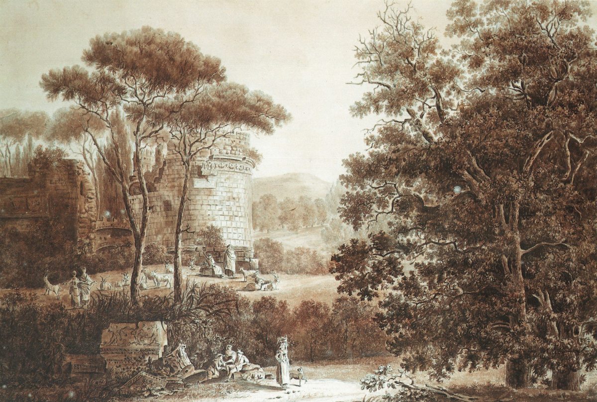 Tombeau des Plautii. Pinceau et lavis brun sur esquisse au graphite.
