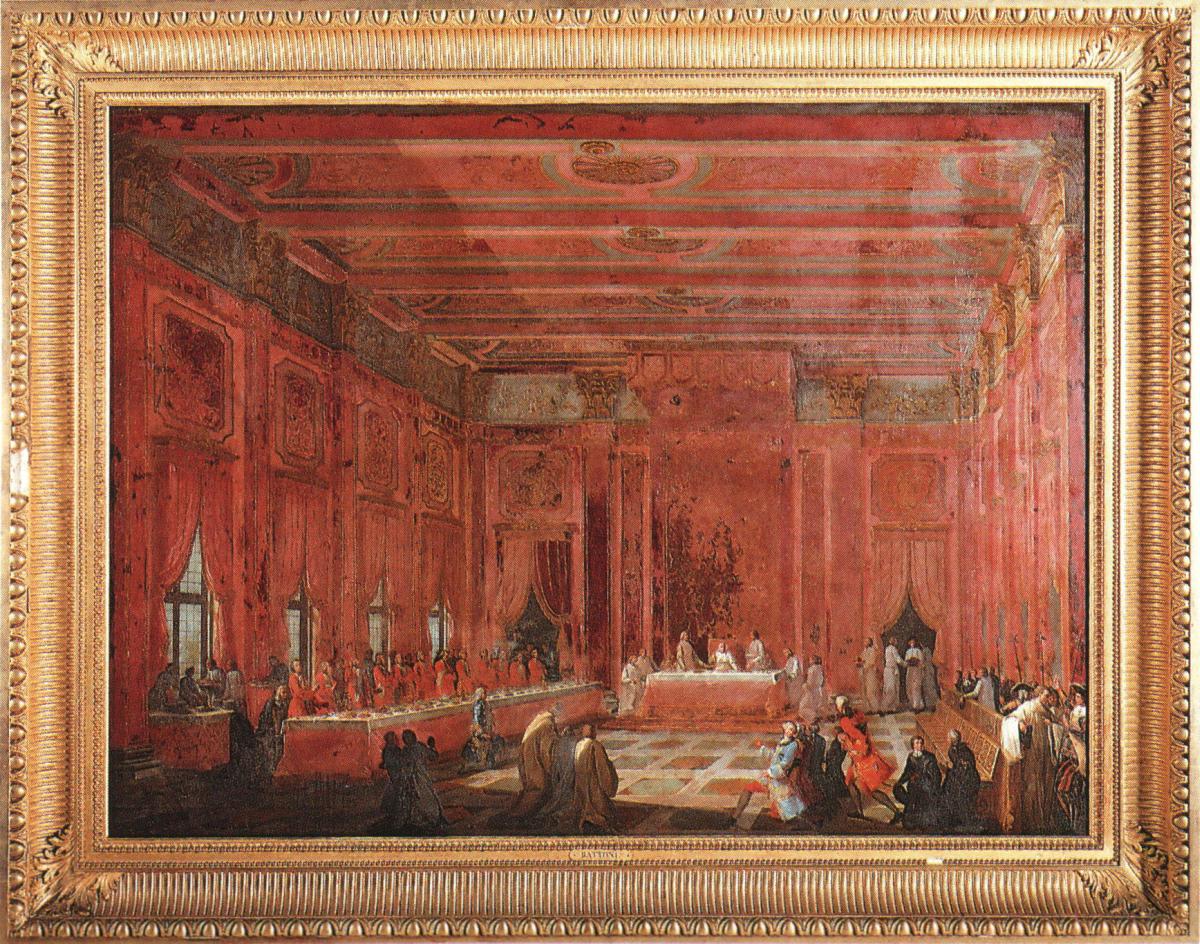 De ces Bourbons originaires d'Espagne, deux grandes compositions du cérémonial à table sont à rapprocher de notre tableau: le repas du mariage par procuration d'Élisabeth Farnèse et de Philippe V, roi d'Espagne, à Parme en 1714, par 10 Spolverini (conservé à Parme, Palazzo del Municipio), et le repas de Charles III d'Espagne, vers 1770, par Luis Paret y Alcazar (conservé à Madrid, au Prado).