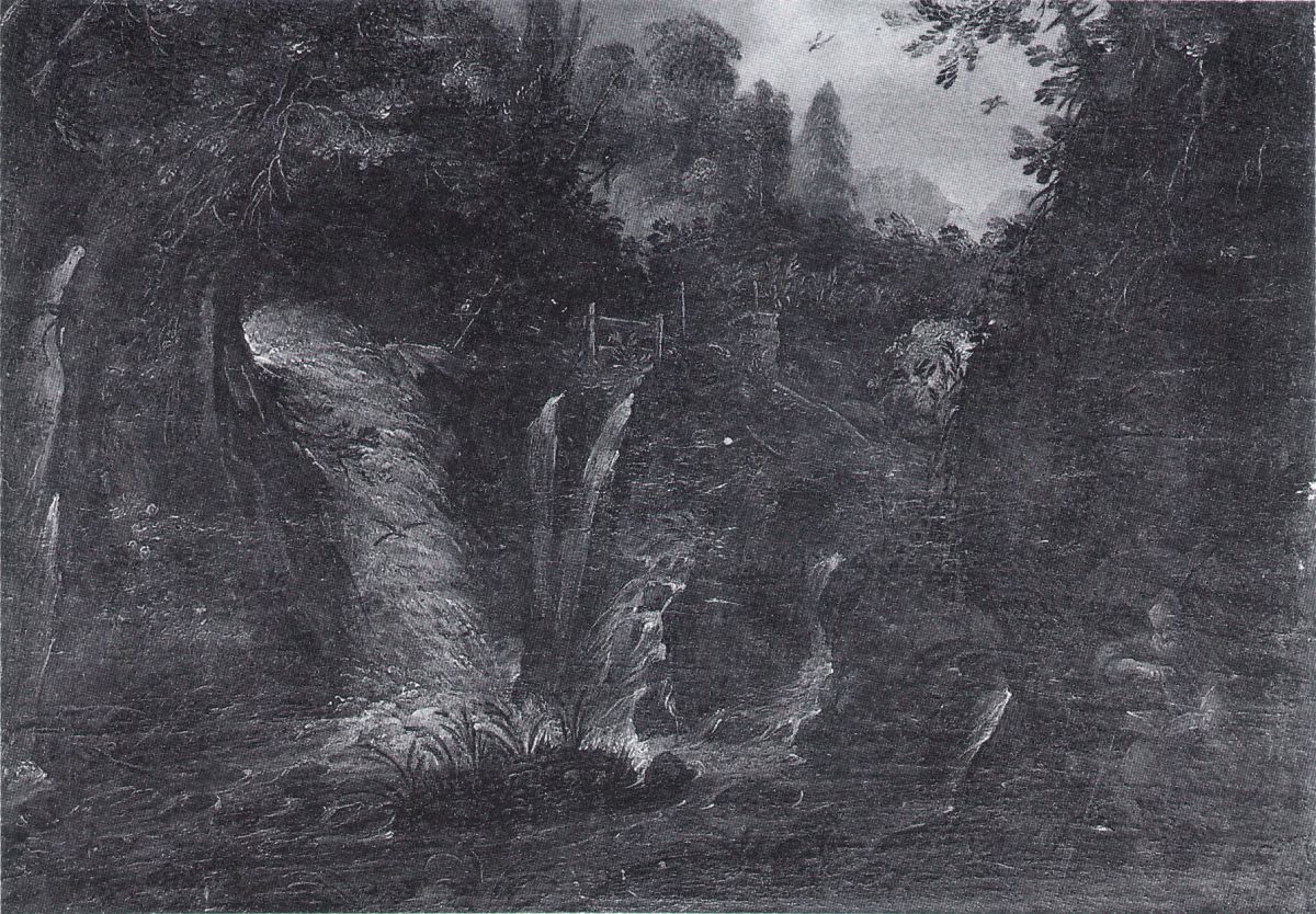 Attribué à Frédéric van VALCKENBORCH (vers 1570-1623). Paysage de cascade avec saint Jérôme. Panneau, une planche, non parqueté.