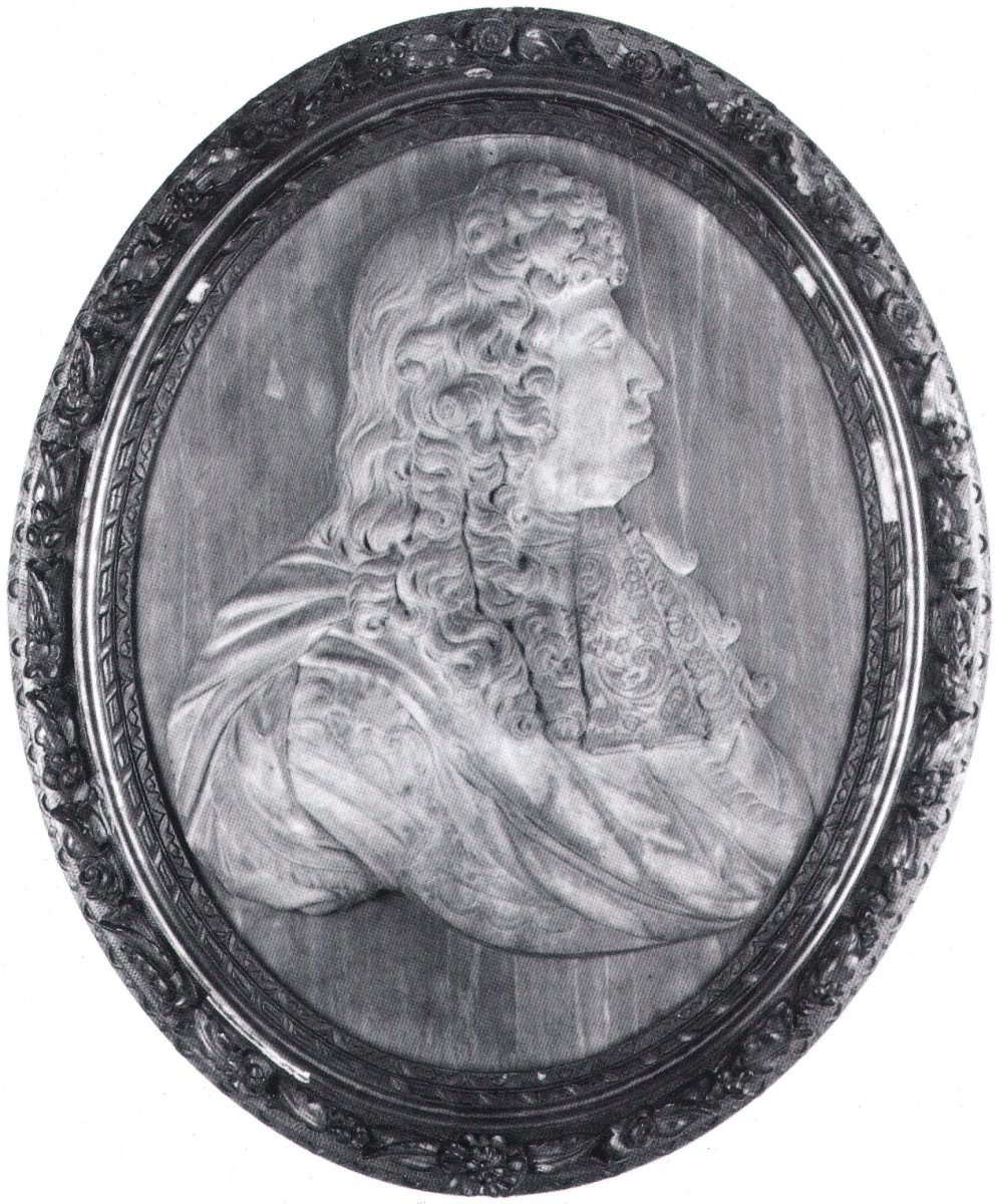 IMPORTANT MÉDAILLON en marbre blanc et bleu de turquin représentant Louis XIV, buste de profil gauche. Cadre ancien en bois doré et sculpté, à décor de guirlandes, fleurs, feuilles de chêne, glands et rubans. Dans le goût du XVIIe.