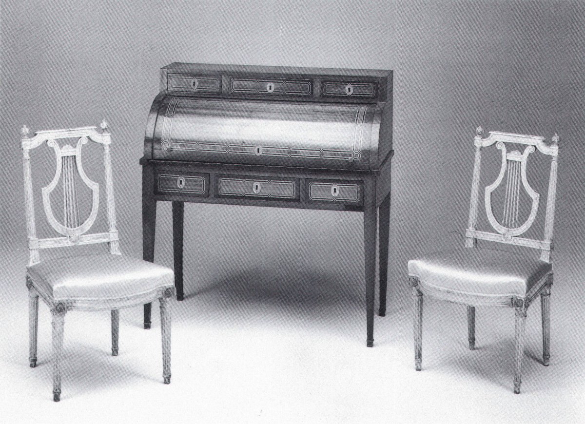 BUREAU DE DAME A CYLINDRE, en placage de bois de rose, satiné et amarante, marqueté de motifs géométriques. Il ouvre à trois tiroirs dans la partie supérieure, un cylindre découvrant un plateau coulissant, deux petits tiroirs et un casier et par trois tiroirs en ceinture. Pieds gaine. Entrées de serrures en bronze, à canaux.