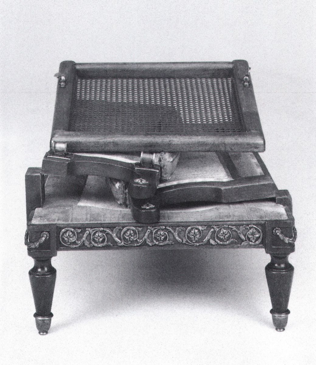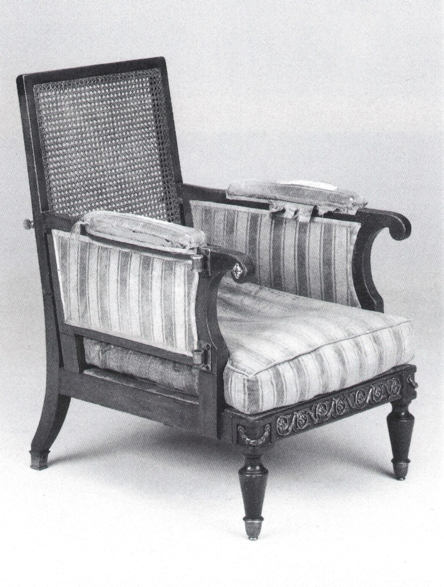 FAUTEUIL d'expédition militaire en acajou, entièrement pliant. Dossier droit canné, bras garni de tissu et bouts d'accotoirs en volute. Pieds antérieurs fuselés et postérieurs sabre. Ce fauteuil comportait un bras de lecture mobile dont il reste les attaches. Frise de rinceaux en bronze rapporté.