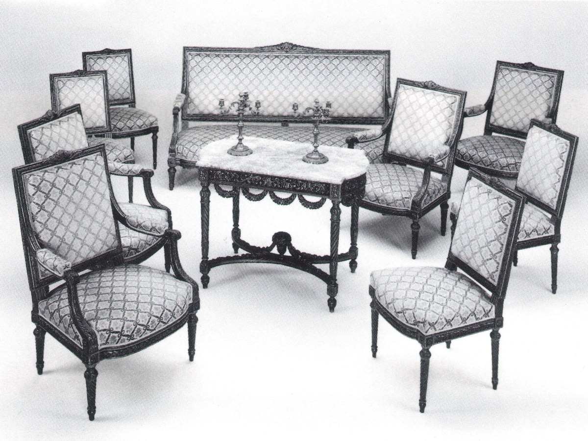 IMPORTANT MOBILIER DE SALON en bois redoré et sculpté de feuilles d'acanthe, perles, tores de laurier et volutes, comprenant dix pièces: une table de milieu de forme oblongue, à entretoise ornée en son centre d'un vase fleuri, un canapé trois places, quatre fauteuils et quatre chaises. Dossier à la Reine. Ceinture cintrée, dés de raccordement à quatre-feuilles. Piétement à cannelures torsadées. Dessus de marbre brèche.