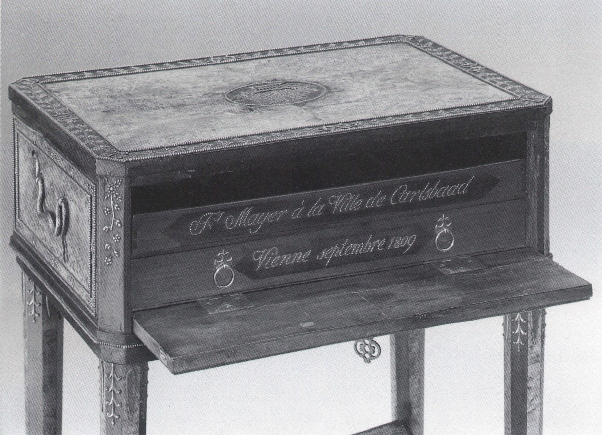 COFFRE en placage d'érable moucheté dans un entourage d'ébène. Frise d'acier marcassite, dessinant de légers branchages et des lyres aux angles. Au centre du plateau supérieur, une corbeille dans un entourage ovale. Deux volets latéraux, l'un d'eux ouvrant à deux tiroirs, portant les inscriptions «F. MAYER à la ville de Carlsbaad» et «Vienne septembre 1809». Il repose sur quatre pieds fuselés à facettes enserrant deux tablettes. Belles poignées latérales en forme de couleuvre.