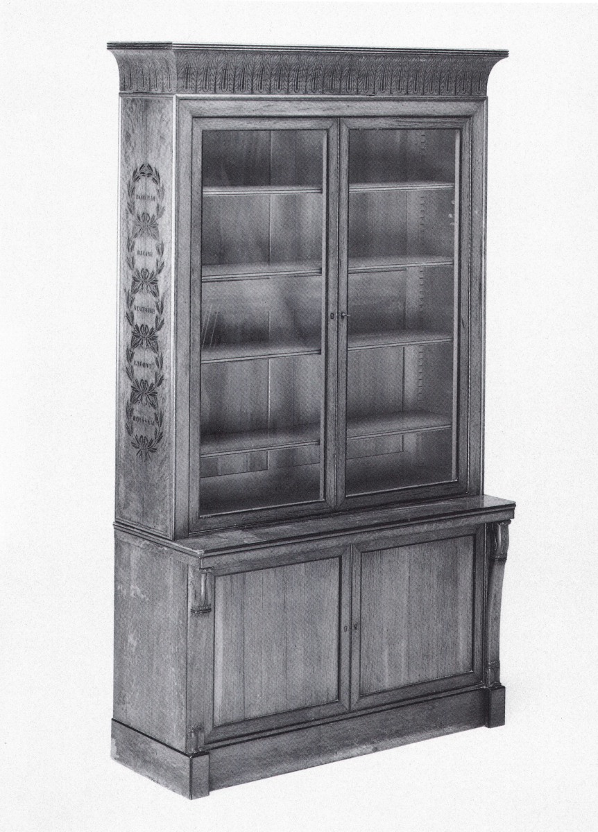 RARE BIBLIOTHÈQUE à deux corps en placage d'acajou chenillé (bois de grage). Partie haute vitrée à deux portes et partie basse pleine, encadrées par des filets d'ébène. Belle corniche à doucine, incrustée de palmettes. Les côtés présentent des inscriptions de noms de grands écrivains: Rabelais, Montesquieu, La Bruyère, Barthélemy, Chateaubriand, Boileau, Racine, Voltaire, La Fontaine et Rousseau, dans des entrelacs de feuillages de laurier, retenus par des rubans. Montants saillants de la partie basse, en forme de consoles, à décor de feuilles d'eau. Fonds en citronnier.