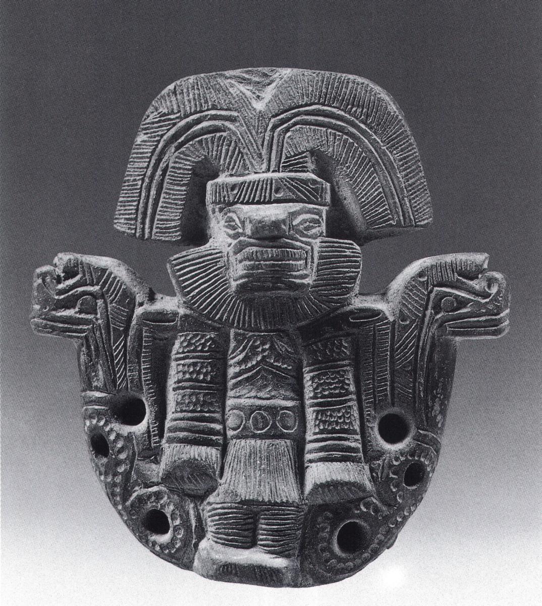Sifflet représentant une gueule de jaguar stylisé et le serpent à plumes que l'on trouve également au Mexique. Il s'agit d'un bel exemple de symétrie bilatérale que l'on trouve dans la plupart des cultures d'Amérique latine, d'Afrique, d'Asie et d'Europe.