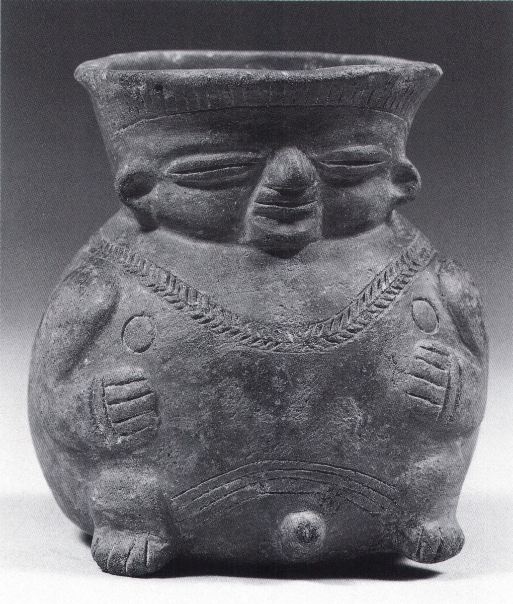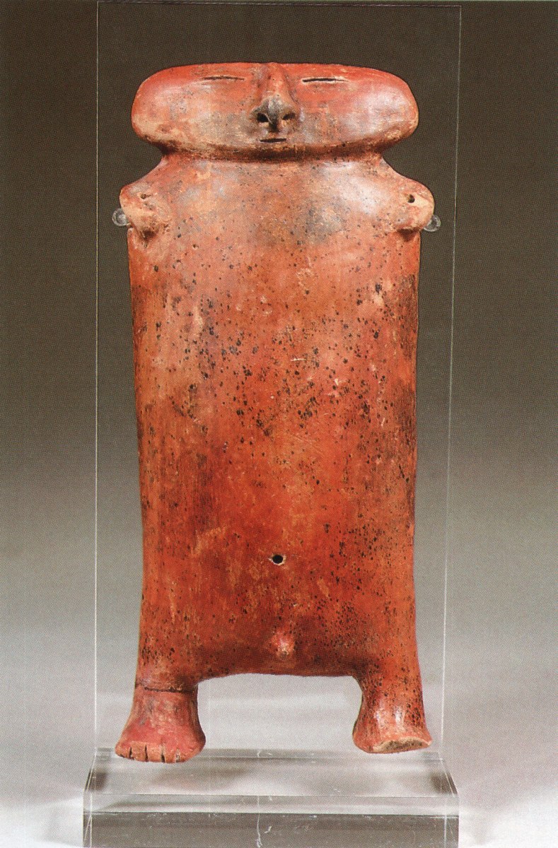 Céramique anthropomorphe représentant un personnage stylisé. Restes de peinture polychrome. Le corps contient une petite boule donnant à la statue une fonction de grelot, fréquente dans l'art Quimbaya et symbole de la vie. Ces instruments de musique rudimentaires étaient utilisés dans les cérémonies funéraires des Quimbayas. Il s'agit d'une pièce authentique, d'une qualité excellente, importante par son esthétique et rare.