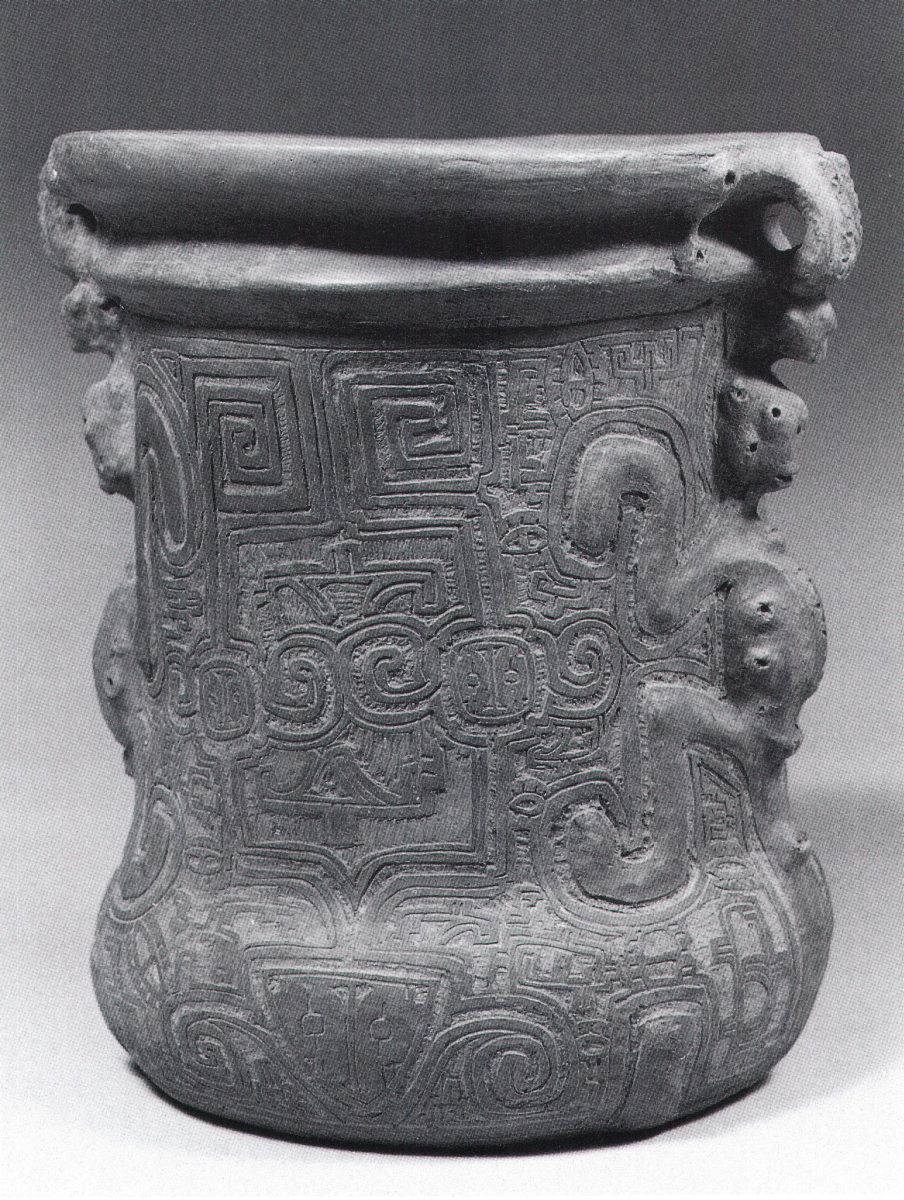 Petite urne funéraire en provenance de l'île de Marajo. La pièce est entièrement intacte. Engobe brun-rouge sur tout le corps de l'urne où sont modelées et incisées des figures anthropo-zoomorphes jumelées. Ces petites urnes ne contenaient pas d'offrandes mais seulement des ossements. Seules les plus grandes renfermaient les deux.