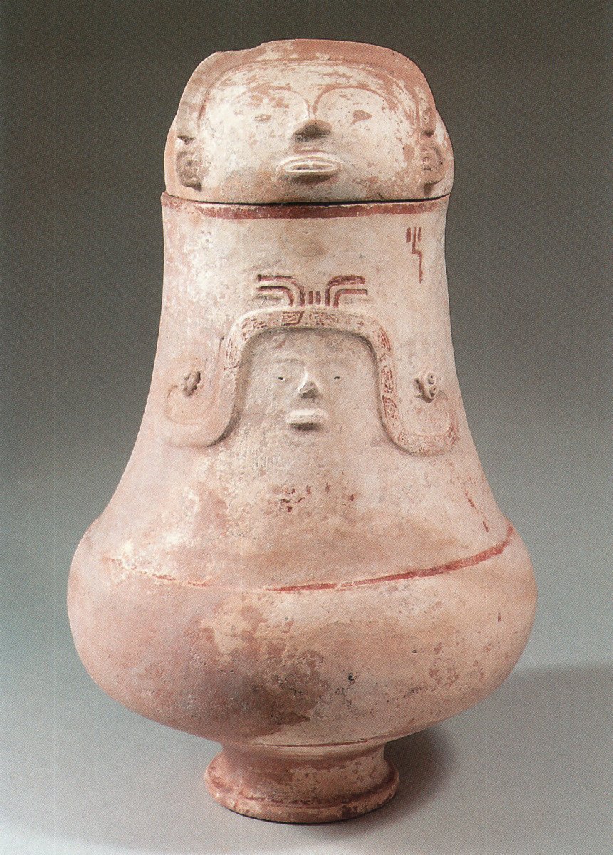 Grande urne funéraire secondaire en provenance de la région de Manaus. La pièce a un couvercle bombé façonné en une tête anthropomorphe stylisée surmontée de volutes. Sur le corps apparaît un visage stylisé encadré d'une sorte d'applique. Le pied est tronconique. Des traces de figures plus géométriques rouges recouvrent l'engobe blanc de la pièce. Il s'agit d'une pièce exceptionnelle, présentée au Musée de la Science de Barcelone lors de l'exposition sur l'Amazonie. Lors de l'inauguration de l'exposition, le ministre de la Culture du Brésil a souligné sa beauté et son extrême rareté; au cours des quinze dernières années, moins de dix pièces semblables mais d'une esthétique inférieure ont été découvertes dans la région de Manaus.