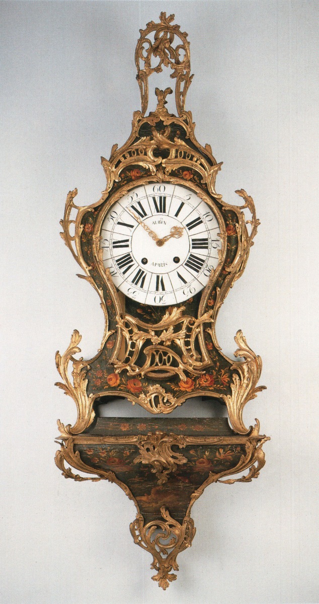 CARTEL d'applique et son socle en vernis Martin par AUBIN à Paris. Fond vert (anciennement bleu), décoré de bouquets de roses fleuries et en boutons. Sur le socle scène animalière dans le goût des fables de La Fontaine. Ornementation de bronzes ciselés et dorés de fleurs, de feuillages ajourés et de volutes rocailles. À l'amortissement, aigrette fleurie habitée d'une colombe; (accdts)