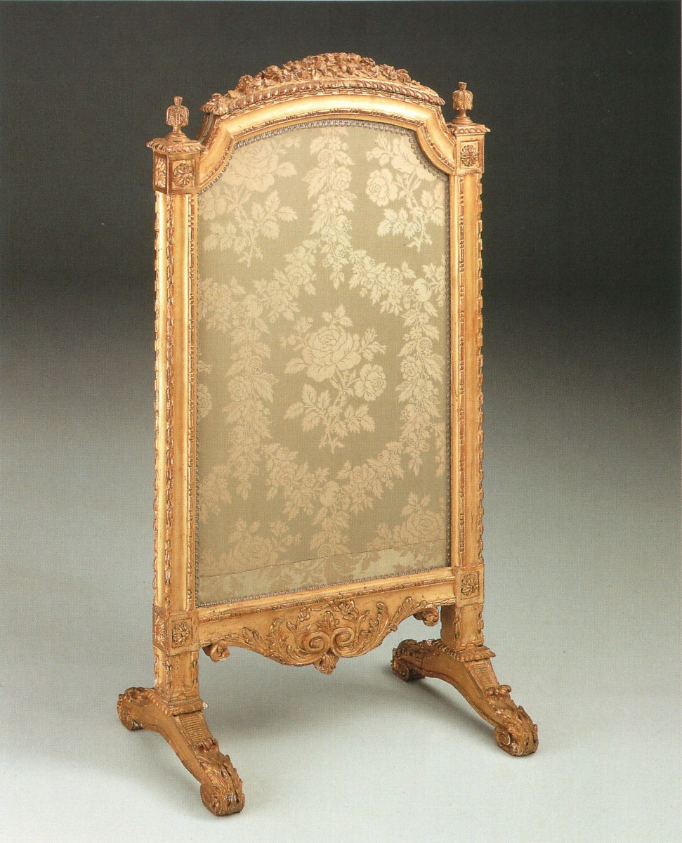 ÉCRAN de CHEMINÉE, en bois sculpté et doré. Montants droits sculptés de rubans enroulés, de perles et culots enfilés, et surmontés de panaches. La traverse basse sculptée d'un-cul-de lampe de feuilles d'acanthe, la traverse haute en anse de panier, ornée d'une gerbe de fleurs nouées par un ruban et posées sur une terrasse godronnée. Piétement bretté, terminé par des volutes d'acanthe. Estampillé G. JACOB, sous la traverse basse.