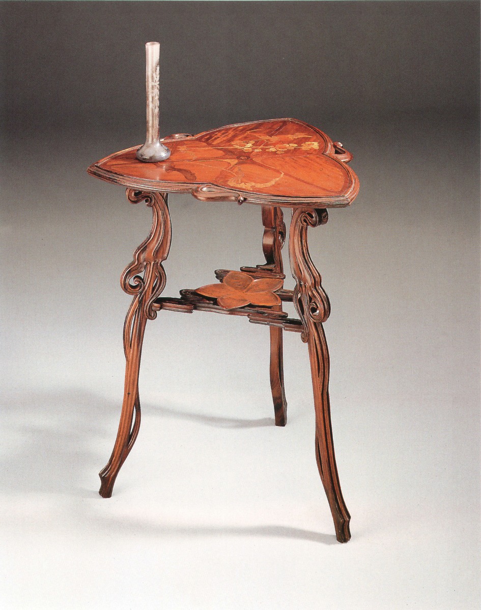 Émile GALLÉ (1846-1904.) SELETTE à deux plateaux en forme de trèfle. Bois de palissandre mouluré; piétement liane avec plateau en marqueterie de bois précieux à décor floral. Signature marqueterie.