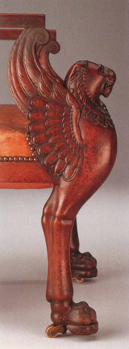 Important FAUTEUIL de CABINET, dit fauteuil «en hémicycle », en acajou sculpté et placage d'acajou. Dossier ajouré à grille et surmonté d'une large traverse cintrée, débordant des montants qui la portent, et reliée à la ceinture par une courbe concave. Supports d'accotoirs sculptés de lions ailés, prolongés par des jarrets articulés et reposant sur de larges patins à griffes. Pieds arrière «en sabre ».