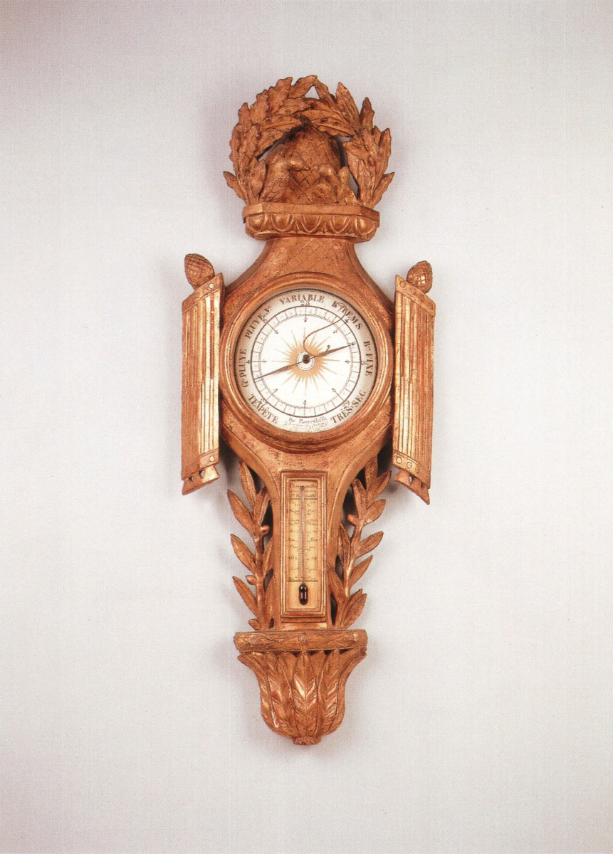 BAROMÈTRE en bois sculpté et doré. La lunette ronde du baromètre est encadrée de deux montants droits cannelés et rudentés surmontés de pommes de pin. Le fronton à jours, orné d'une couronne de lauriers, est habité de deux colombes, posées sur un entablement sculpté d'oves. Le thermomètre est encadré de rameaux d'olivier. Culot feuillagé.
