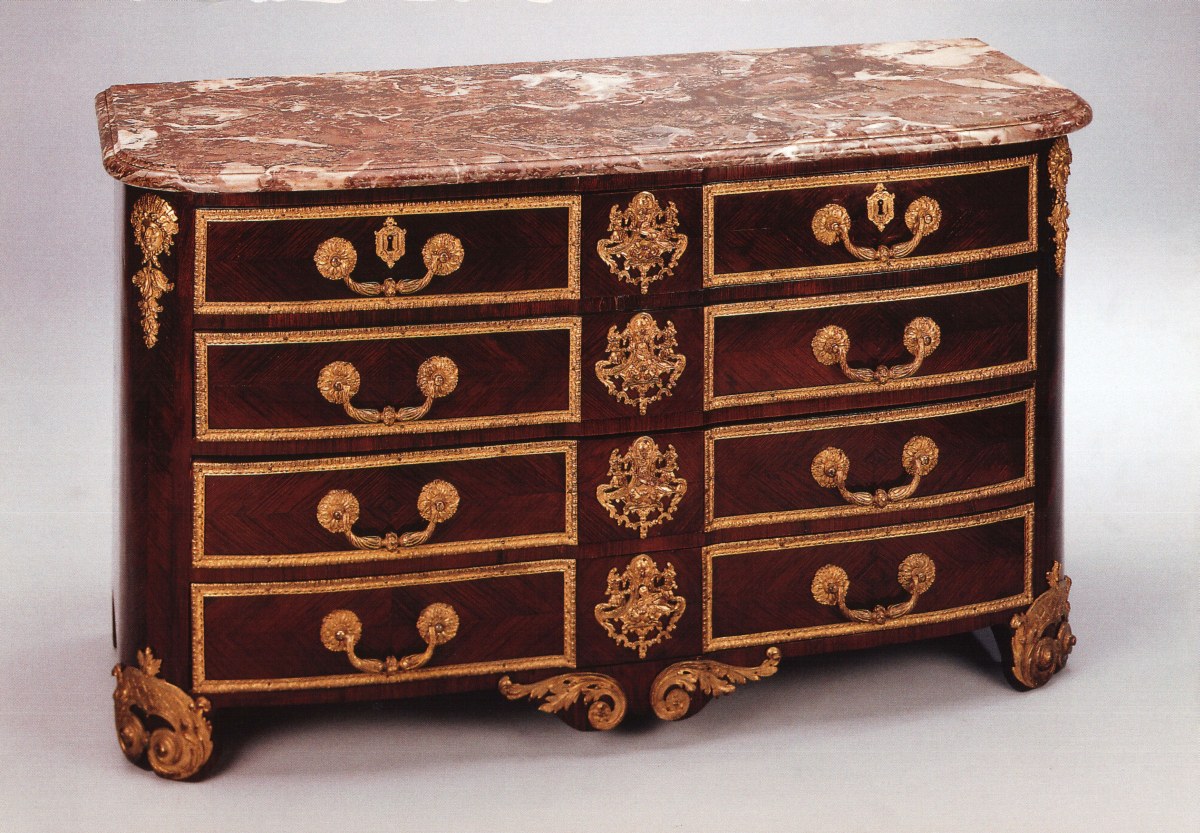 Bois de placage en frisage de palissandre. Riche ornementation de bronzes dorés. Marbre Languedoc à bec de corbin.