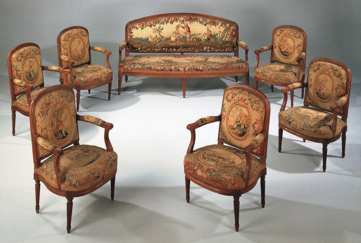 MOBIlIER de SALON en noyer ciré, mouluré et sculpté, comprenant: un canapé et six fauteuils à la reine. Dossiers plats comportant une traverse haute arrondie, assise en « fer à cheval» portée par quatre pieds fuselés et cannelés, rudentés à l'avant. L'ensemble est recouvert d'une tapisserie fine d'Aubusson, polychrome à rehauts rouges, ornée de médaillons historiés dans des alentours fleuris; figurant les enfants jardiniers -dans le goût de Boucher et J.-B. Huet, sur les dossiers et des scènes d'après les fables de La Fontaine sur les assises -d'après J.-B. Oudry. (Usures et accidents.)
