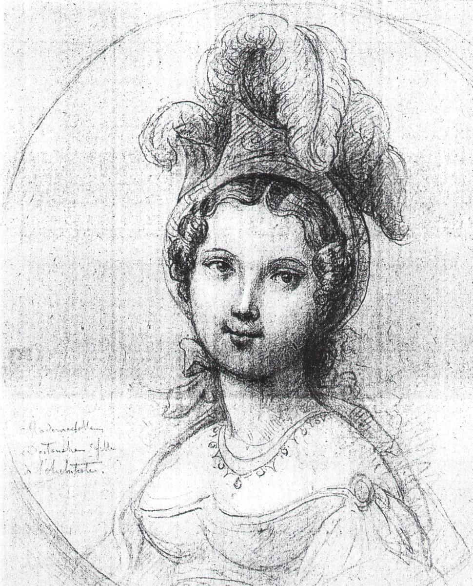 Née à Paris en 1822, Mlle Nency Destouches était la fille de M. Louis-Nicolas-Marie Destouches, architecte*, et de Mme Destouches, née Armande-Edmée Charton. Elle épousa Hector Lefuel, architecte du nouveau Louvre. Une anecdote amusante mentionnée dans le catalogue de l'exposition Seligman nous indique que «la correspondance de M. et Mme Destouches paraît avoir été détruite par Mme Lefuel, leur fille ». Notre dessin est à rapprocher du célèbre dessin d'Ingres représentant Mme Louis-Nicolas-Marie Destouches, née Armande-Edmée Charton, signé et daté en bas à gauche: Ingres delineavitt / Rome 1816, conservé au Musée du Louvre (voir H. Naef, op. cit., supra, vol. IV n° 192). Sans posséder la majesté et la beauté du portrait en pied de sa mère, notre dessin présente néanmoins plusieurs similitudes fort intéressantes, hormis la ressemblance physique: Mlle Destouches, parée d'un collier imitant celui de sa mère, porte également ce fameux chapeau à plumes qu'Ingres avait jugé bon de présenter devant derrière sur la tête de son modèle, le jugeant ainsi plus seyant, coiffure étonnante et admirablement réussie « qui n'a cessé de réjouir, par son imprévu, les fervents ingristes»: voir M. Delpierre, Ingres et la mode de son temps (d'après les portraits dessinés), BM l.37, Montauban, juillet 1975. Il faut donc voir dans cette volonté de mimétisme du dessin de Mlle Destouches un double hommage: à sa mère superbement immortalisée, mais aussi au chef-d'œuvre d'Ingres demeuré dans sa famille jusqu'en 1891.