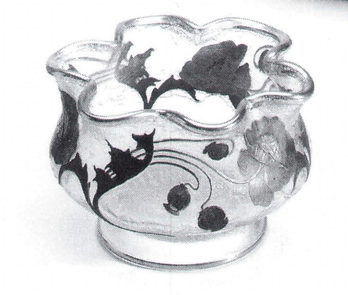COUPE de forme circulaire à six lobes, sur piédouche, en verre blanc en partie irisé. Décor de filets et de fleurs de pavots, dans des tons dorés, mauves et verts.