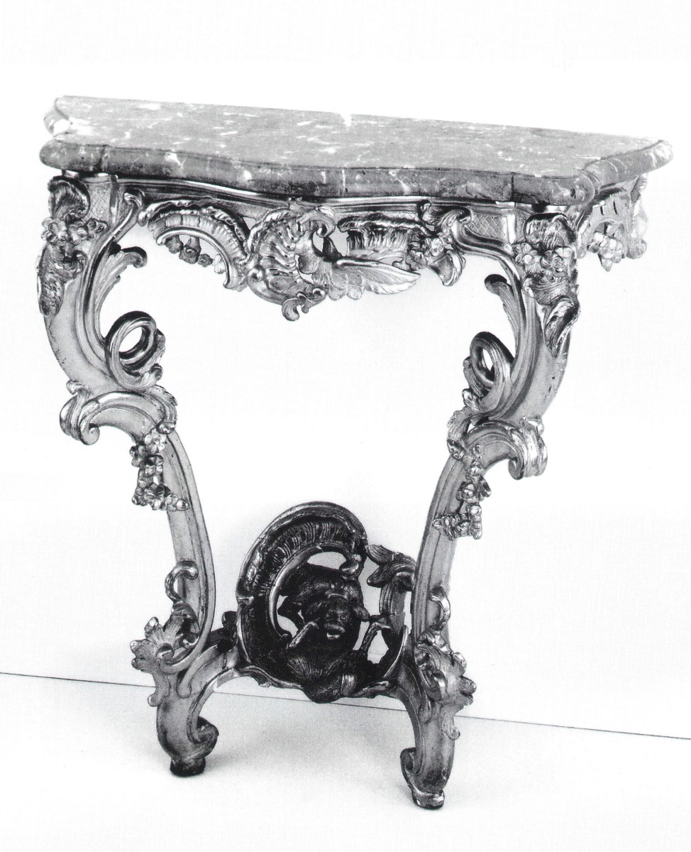 CONSOLE mouvementée en bois sculpté et redoré à décor d'aile, d'agrafes et de chutes de fleurs. Elle repose sur deux pieds cambrés à double évolution, réunis par une entretoise dont la noix figure un chien de chasse saisissant un gibier. Dessus de marbre brèche rose.