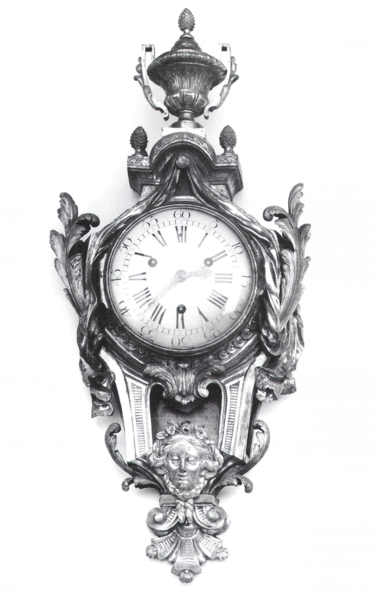 CARTEL D'APPLIQUE en bronze ciselé et doré (usures). Il est coiffé d'un vase à l'antique dans un entourage de quatre pommes de pins. Le cadran émaillé est coiffé par une étoffe qui s'enroule sous des feuilles d'acanthe. Décor d'un mascaron et d'une palmette, de frises de flots, de piastres et de cannelures. Mécanisme signé Nicolas CLÉMENT, à Paris.