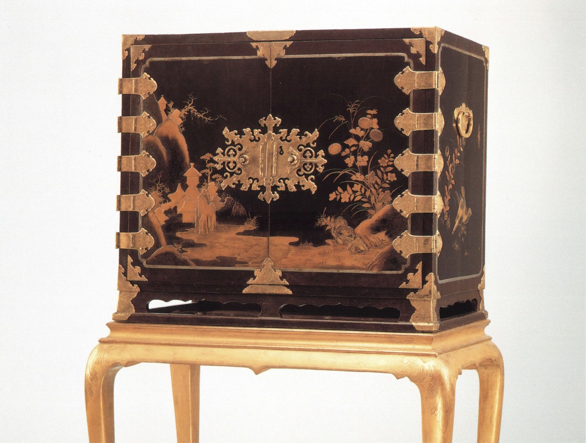 CABINET en laque du Japon à fond noir, rehaussé à décor or, argent, brun et rouge: d'arbres fleuris et feuillagés, paysages montagneux aux architectures hardies, papillon et couples de perdrix. Il ouvre par deux portes laquées qui découvrent dix tiroirs également laqués.