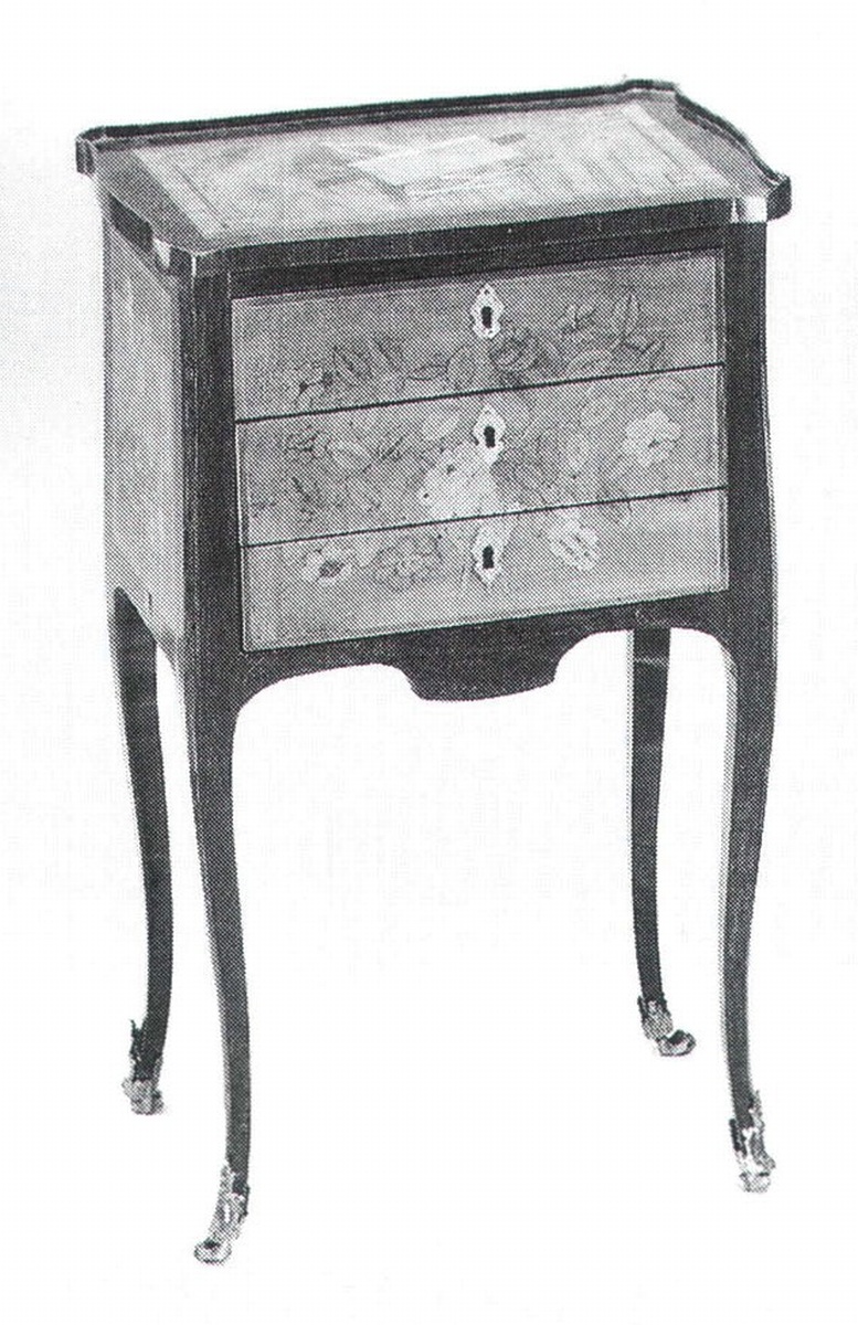 CHIFFONNIÈRE-TABLE A ÉCRIRE en bois de placage toutes faces. Elle ouvre à trois tiroirs sans traverse. Marqueterie de couleur à décor de trophée à la Science sur le plateau et d'un bouquet de fleurs sur les quatre faces. Montants droits et pieds cambrés.
