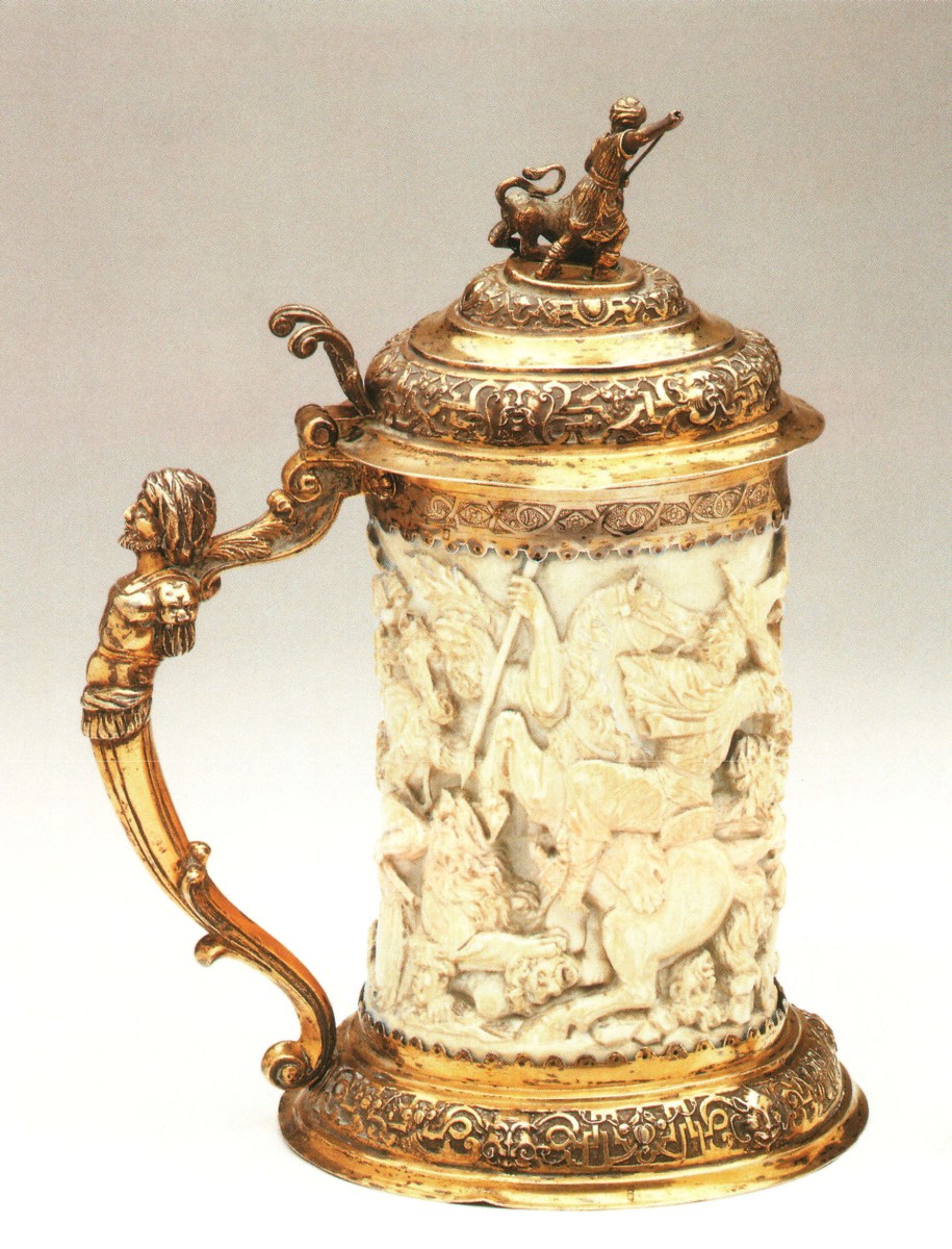 IMPORTANTE CHOPE à boire, en vermeil ciselé et gravé d'entrelacs feuillagés et mascarons. Le couvercle est surmonté d'un lion attaquant un personnage oriental. L'anse à contre-courbe est ornée à mi-corps du torse ciselé d'un personnage oriental.