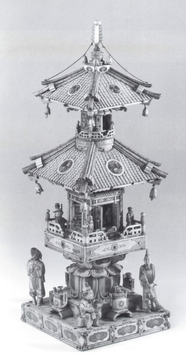 PAGODE en ivoire sculpté incrusté de nacre, animée de personnages. La charpente aux toits recourbés à quatre arêtes s'articule sur un mât en forme de lotus. Effets de clair-obscur des fenêtres treillisées et des portes ajourées.