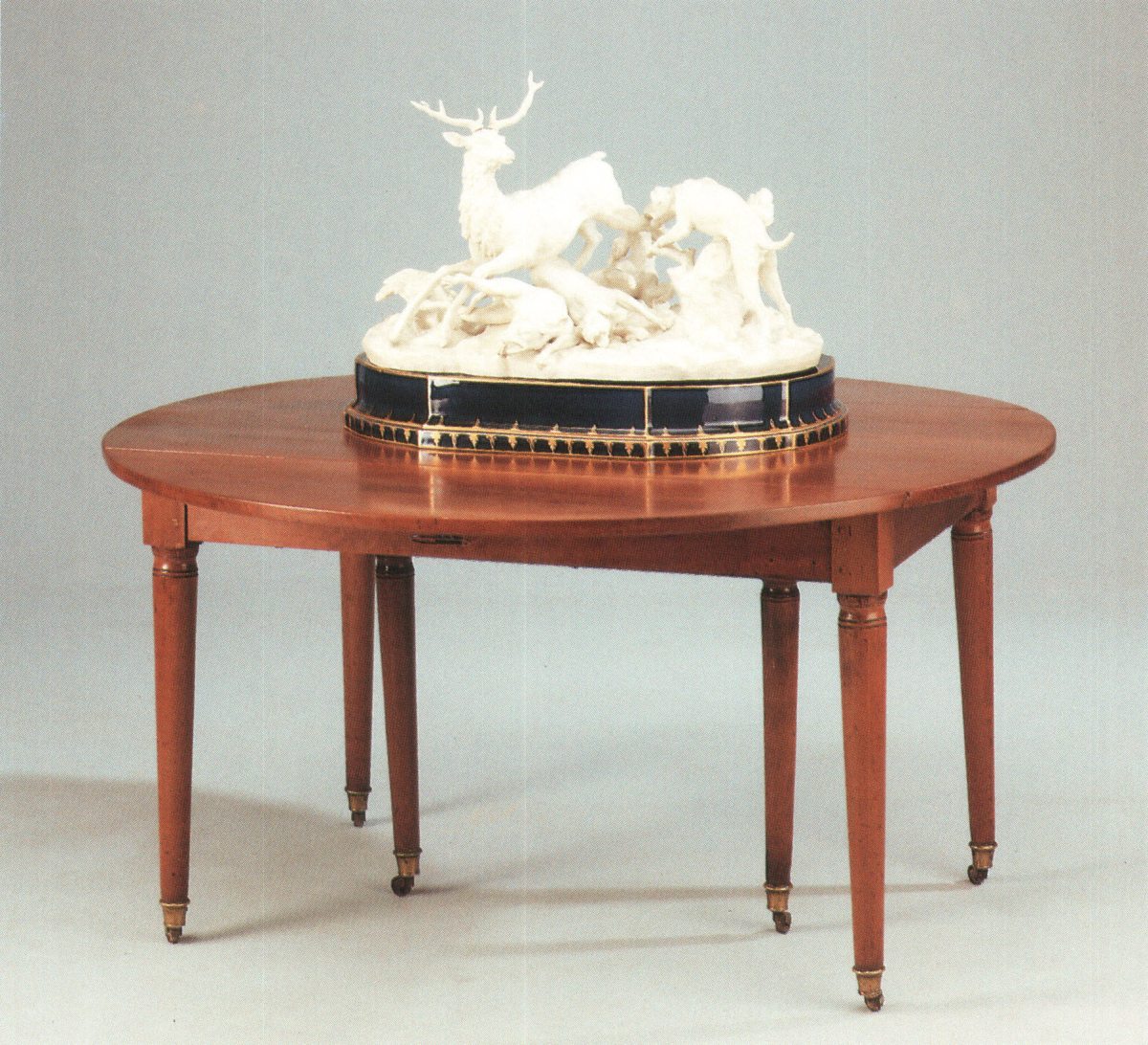 TABLE RONDE en acajou, reposant sur six pieds fuselés à sabots en bronze doré et montés sur roulettes.