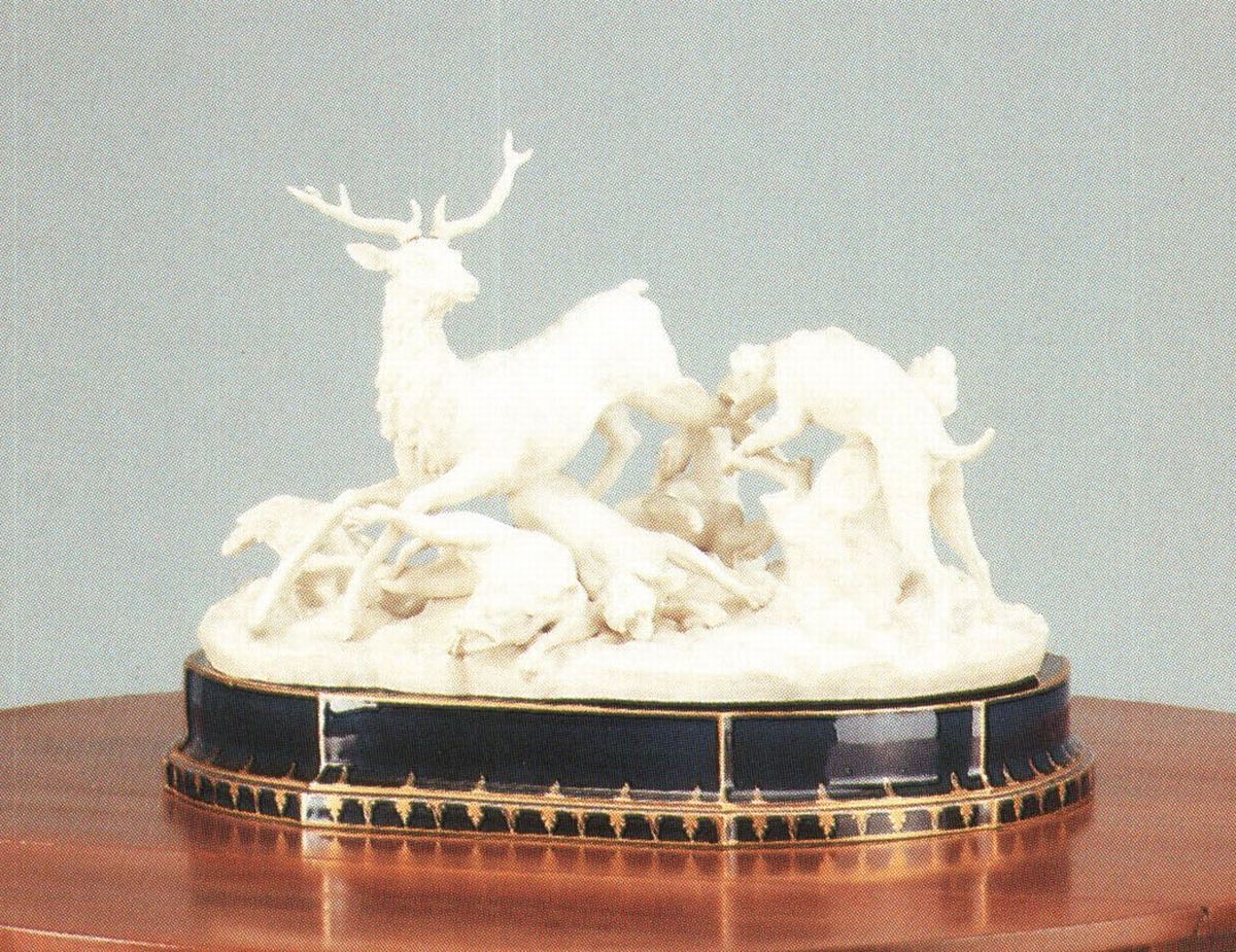 SÈVRES, groupe en biscuit: cerf attaqué par les chiens.