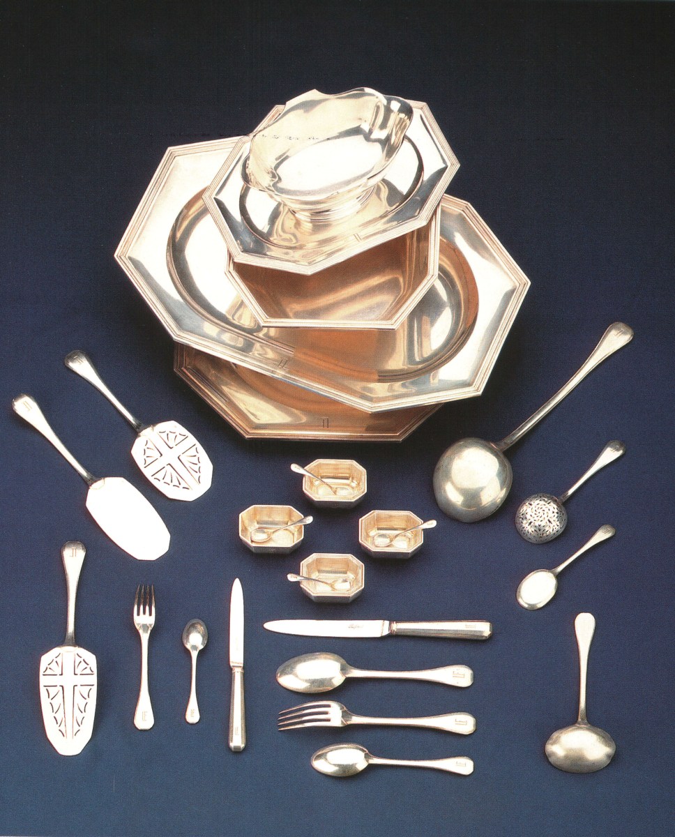 MÉNAGÈRE de COUVERTS: 3 pelles ajourées, 1 louche, 1 cuillère à crème, 1 cuillère saupoudreuse, 12 cuillères de table, 24 fourchettes de table, 12 cuillères à desserts, 12 fourchettes à dessert, 12 cuillères à glace, 12 cuillères à café, 12 couteaux de table, 12 couteaux à fromage, 12 couteaux à fruits.