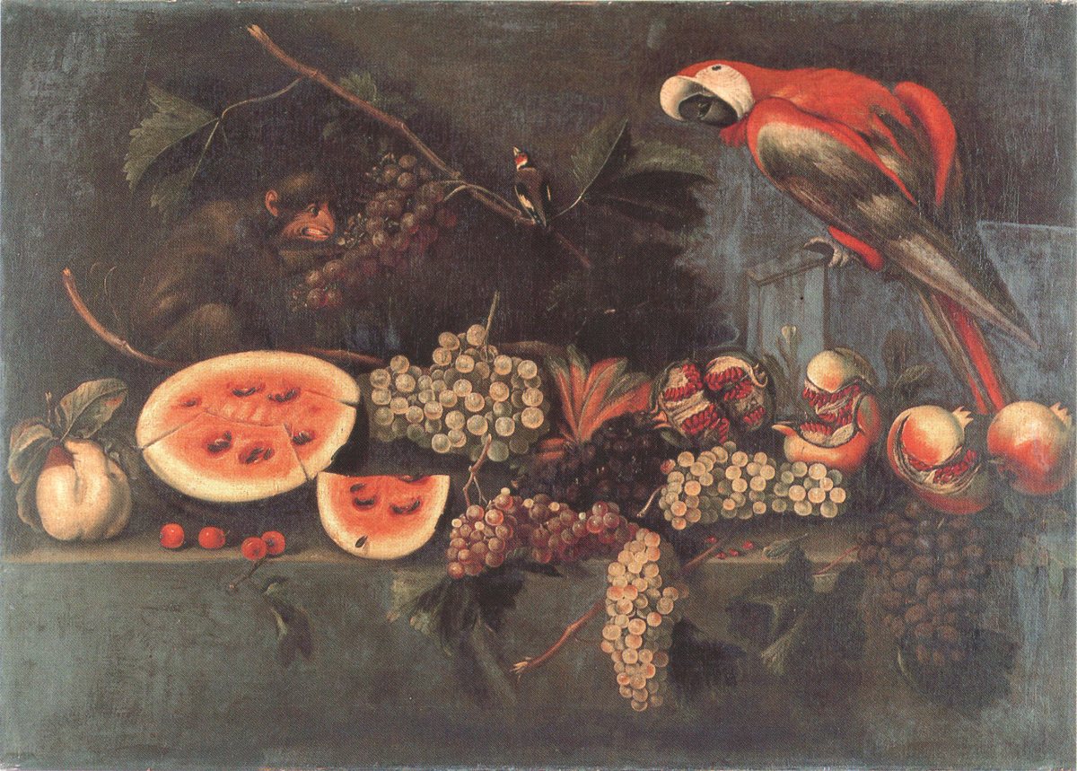 Nature morte au vase de fleurs, coupe de cerises et papillons. Toile.