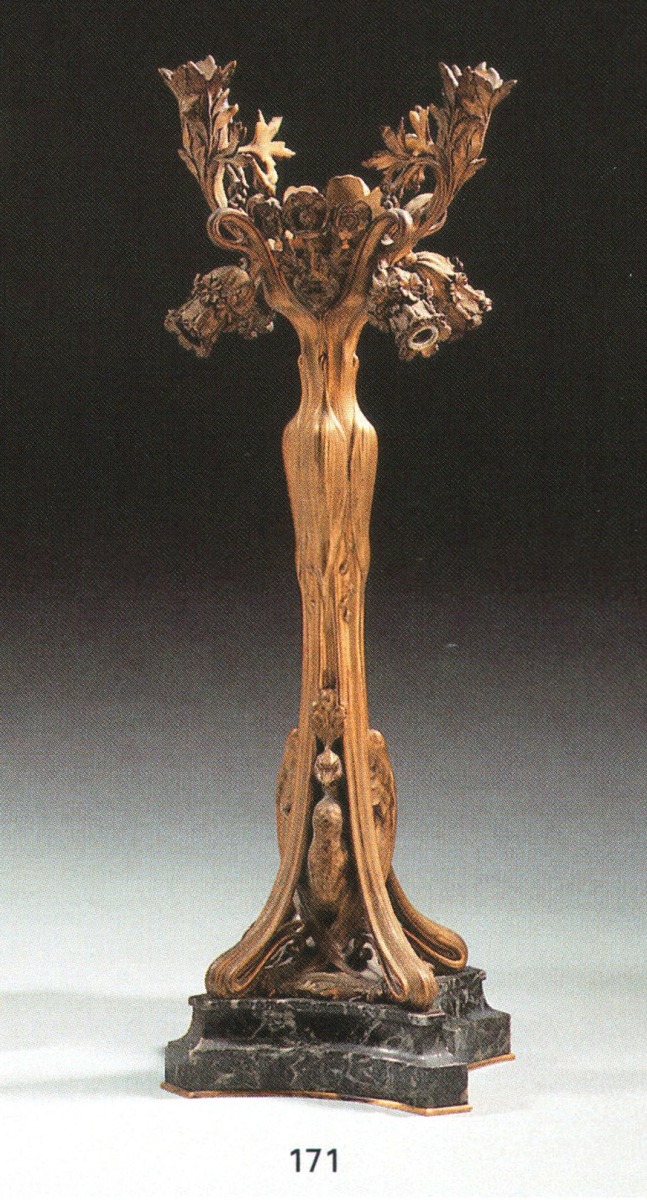 Piétement de lampe arqué en bronze doré, de tiges-lianes ornées de fleurs dont coquelicots-pavots, retenant un oiseau à aigrette-paon. Eclairage par 4 binets feuillagés en position basse et 2 en registre supérieur, entourant une septième source lumineuse. Base en marbre vert antique sur plaque de bronze.