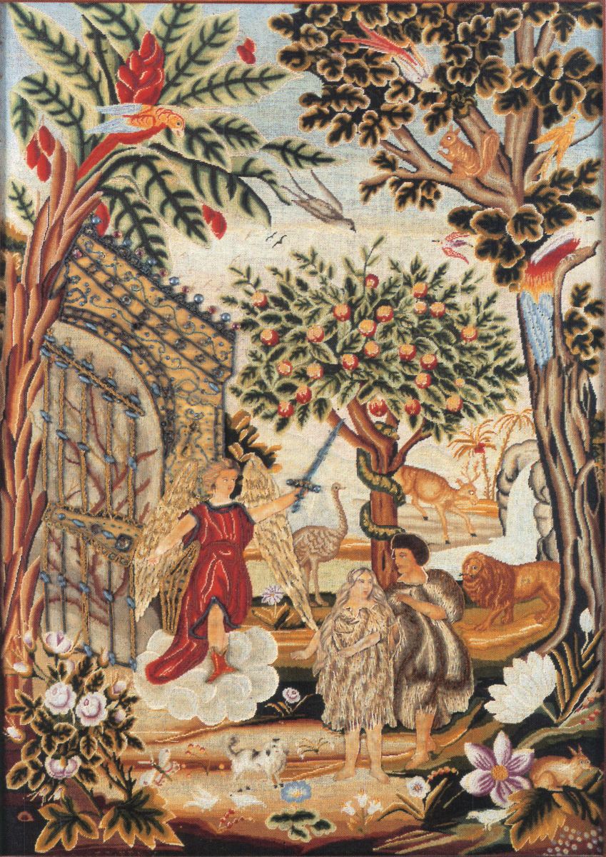 PANNEAU de TAPISSERIE représentant l'Archange saint Michel ouvrant la porte du Paradis pour en chasser Adam et Ève, vêtus de peaux de bête. Applications de velours, soie, perles et sequins soulignant certains détails.