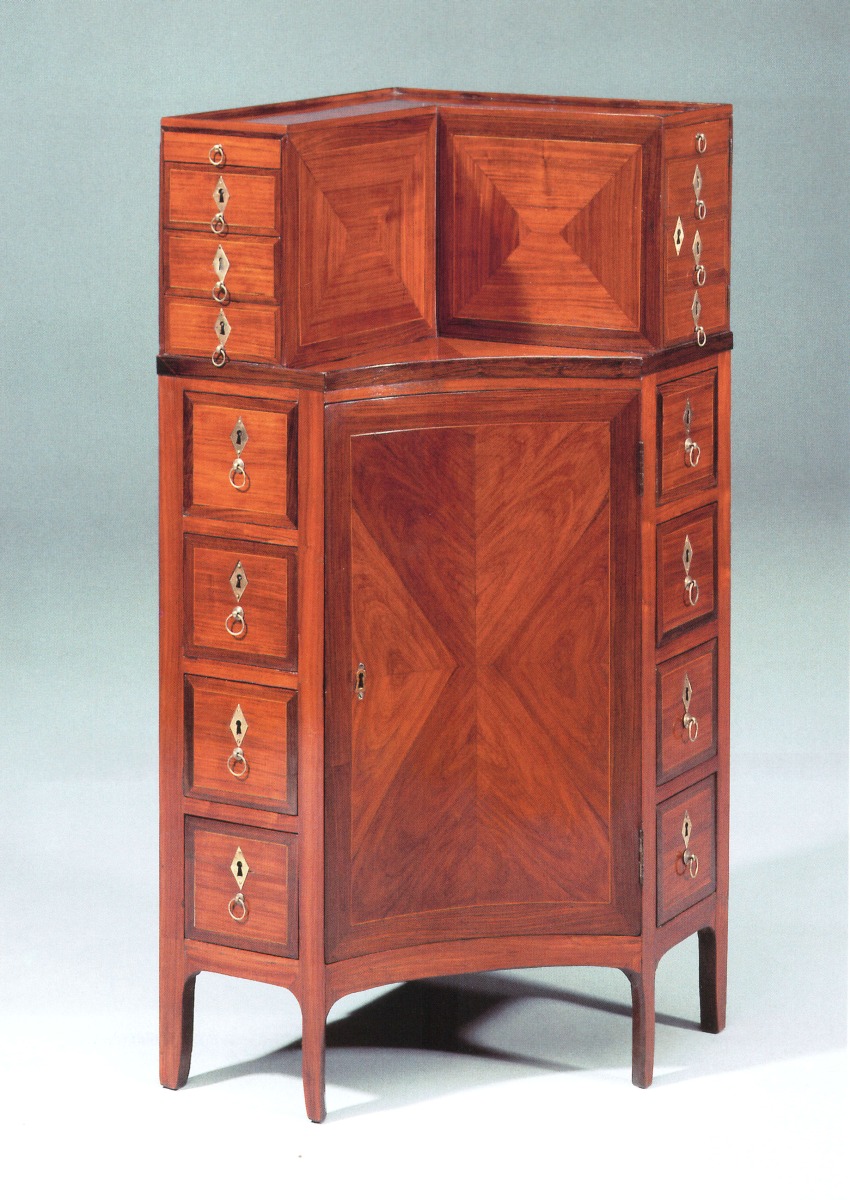 Il ouvre par une porte de forme concave en façade, bordée verticalement de part et d'autre de quatre tiroirs superposés. La partie supérieure est formée d'un décrochement en tablette, encadré de part et d'autre de tiroirs et d'une porte simulant de faux tiroirs. Entrées de serrure losangiques en laiton.