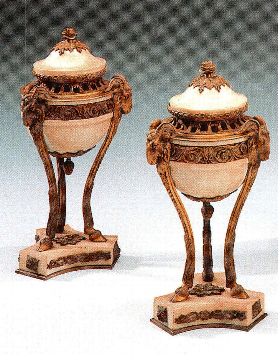 Riche ornementation de bronzes dorés et ciselés: monture tripode à têtes de béliers terminée par des sabots, galerie de flots et d'entrelacs, pomme de pin, guirlandes et fretel floral.