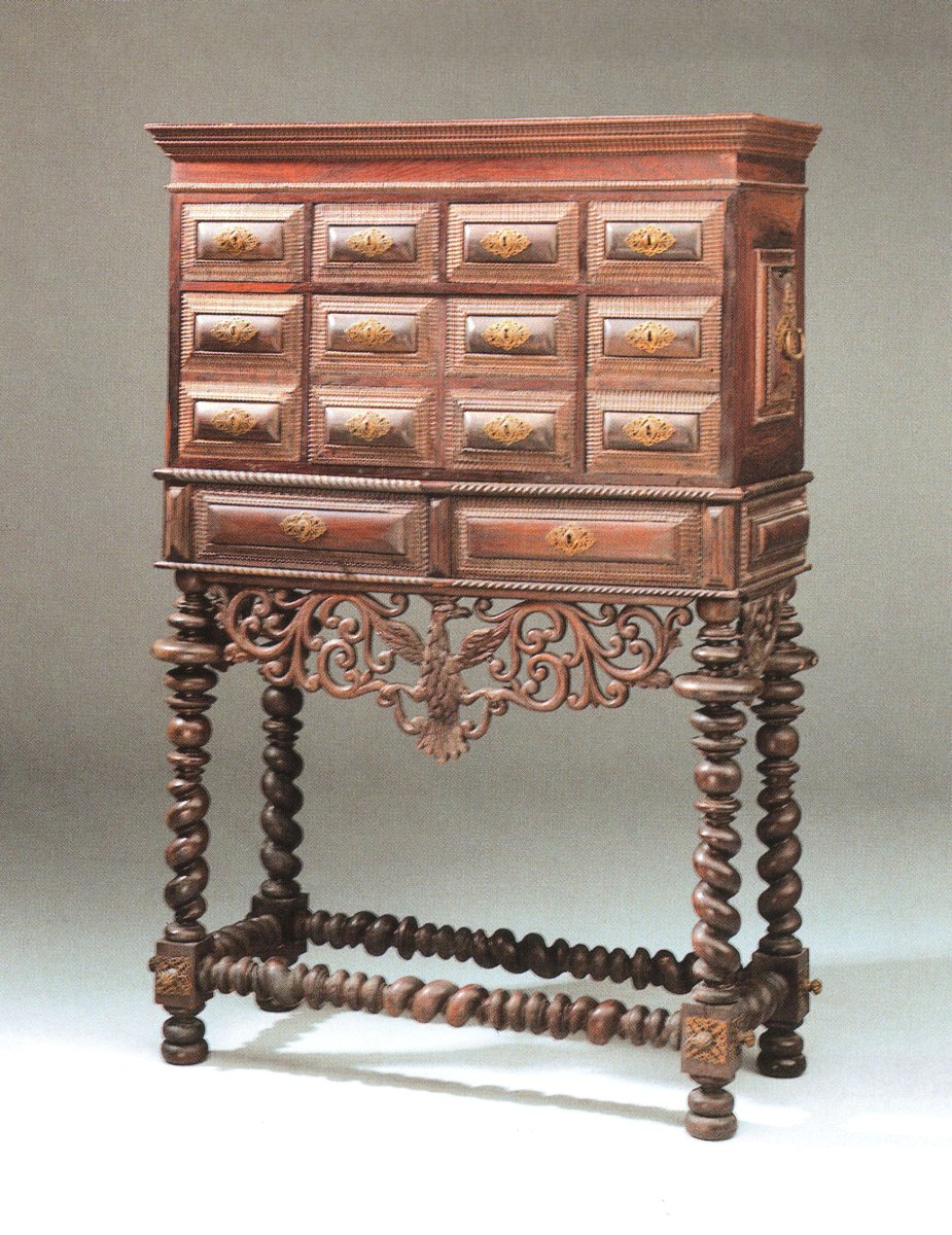 CABINET dit «CONTADOR» et son piétement, en bois exotique rouge. Il ouvre à 12 tiroirs en façade, et deux en ceinture. Moulures à denticules dites tremidos encadrant les panneaux géométriques des tiroirs en saillie. Le cabinet est soutenu par un piétement très ouvragé aux pieds et entrejambes tournés en chapelets et en spirales. Ceinture ornée d'un large motif de volutes encadrant un oiseau couronné. Garniture de cuivre ajourée en application aux serrures, dés de raccordement et poignées latérales. (Accidents.)