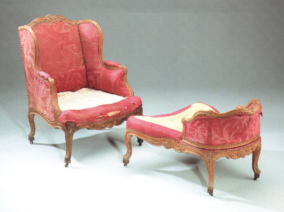 DUCHESSE à oreilles, brisée en deux parties en hêtre mouluré et richement sculpté de cartouches, fleurettes, feuillages et rocailles; accoudoirs et pieds cambrés. Garniture en damas de soie cramoisie à décor floral.