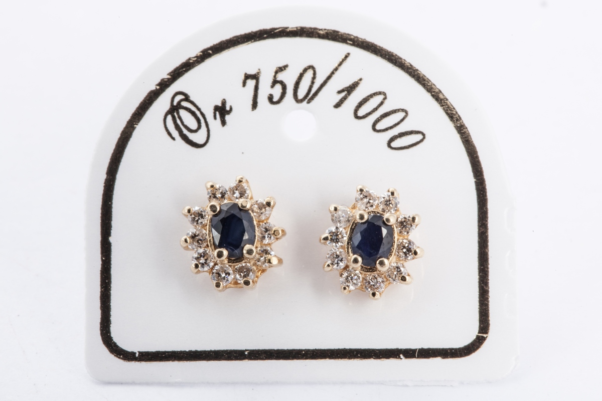 Paire de BOUTON d'OREILLE en or jaune, sertie d'un saphir ovale dans un entourage de diamants ronds de taille brillant.