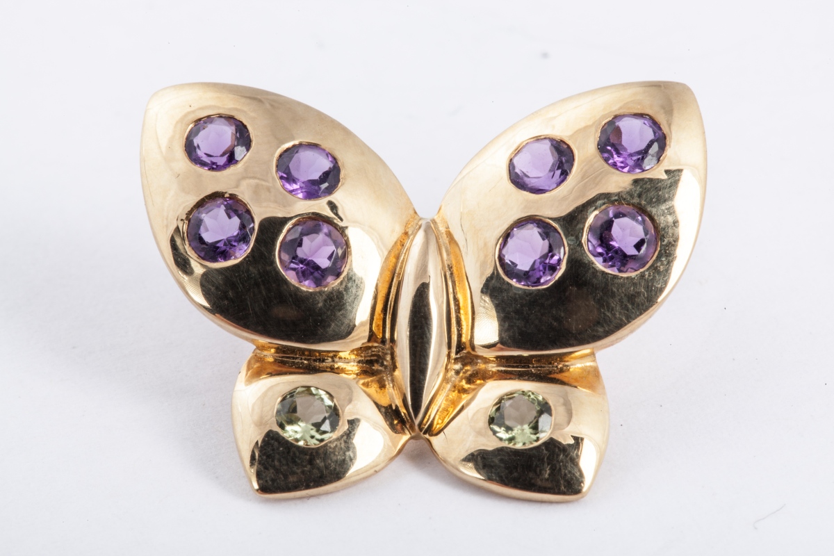 PENDENTIF papillon en or jaune, serti d'améthystes et de quartz vert.