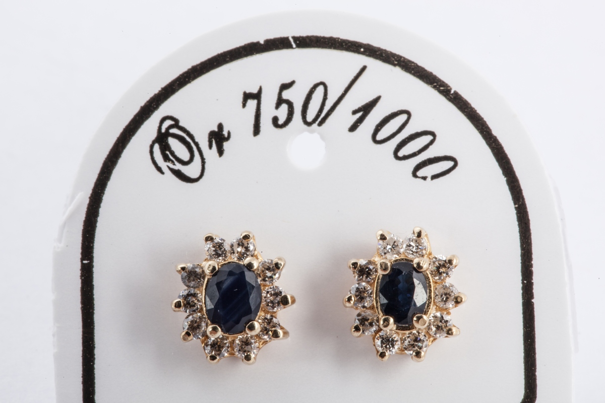 Paire de BOUTONS d'OREILLE en or jaune, sertie d'un saphir ovale dans un entourage de petits brillants.
