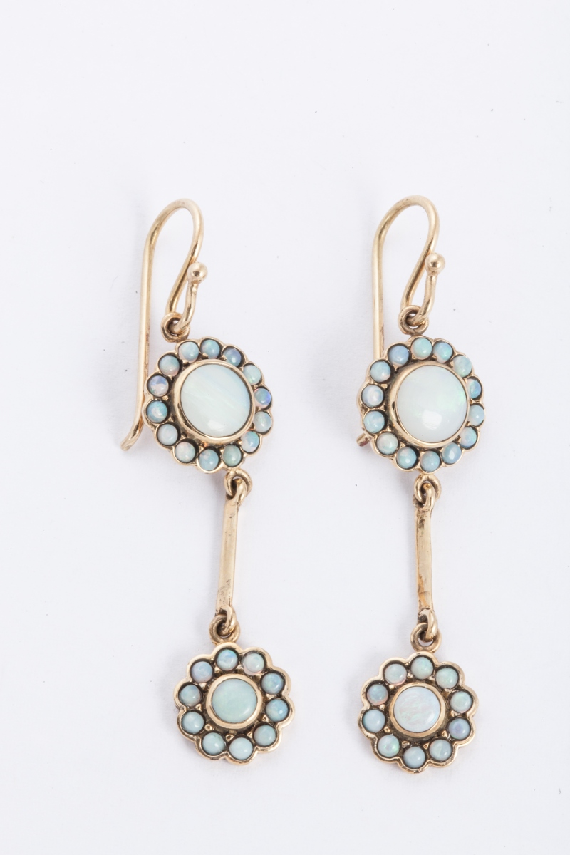 Paire de PENDANTS d'OREILLE en or jaune, à décor de fleurettes serties de cabochons d'opales.
