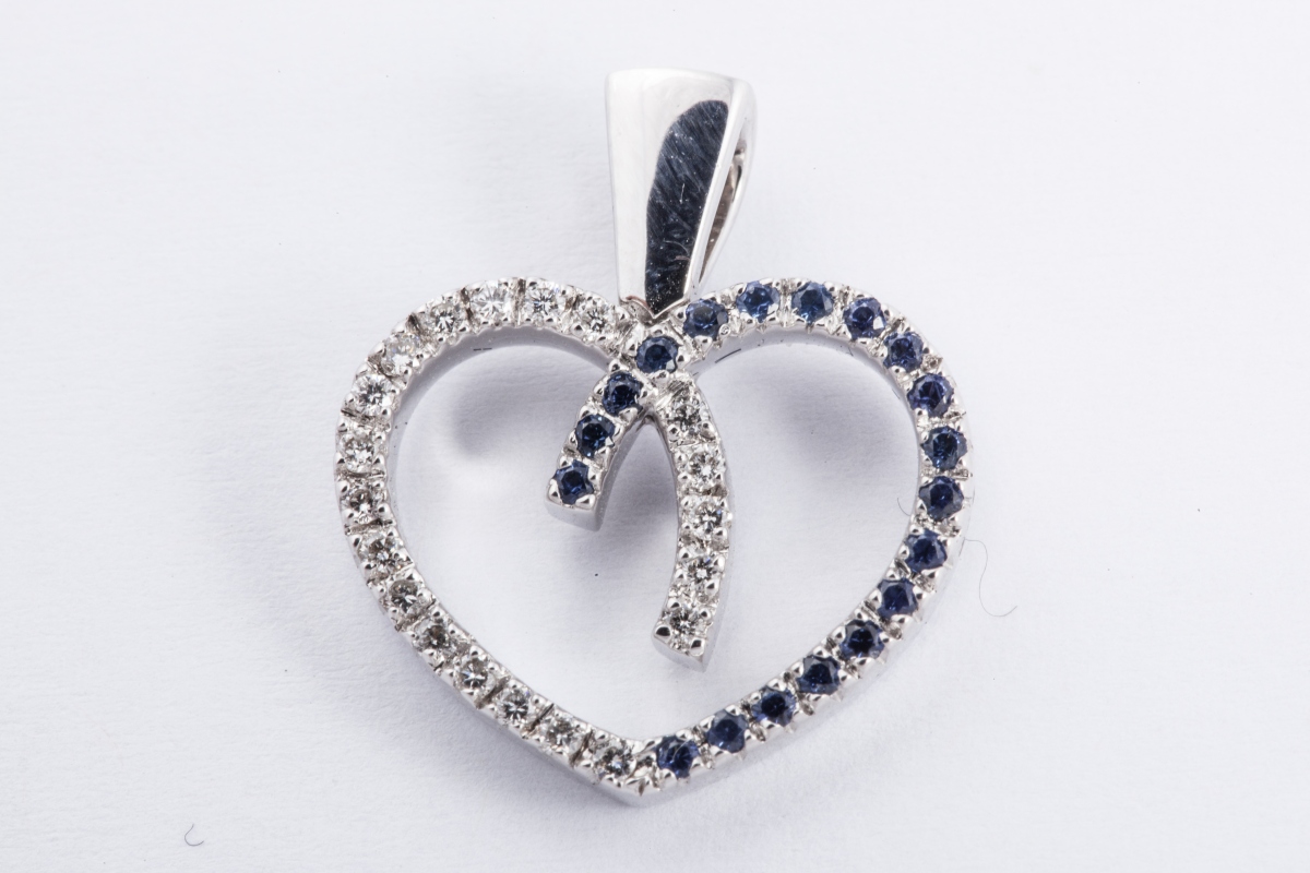 PENDENTIF coeur ajouré en or gris, serti de petits saphirs et brillants.