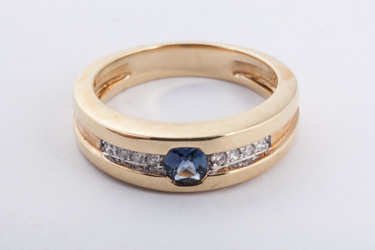 Bague jonc en or jaune, sertie d'un saphir coussin épaulé de lignes de petits brillants.