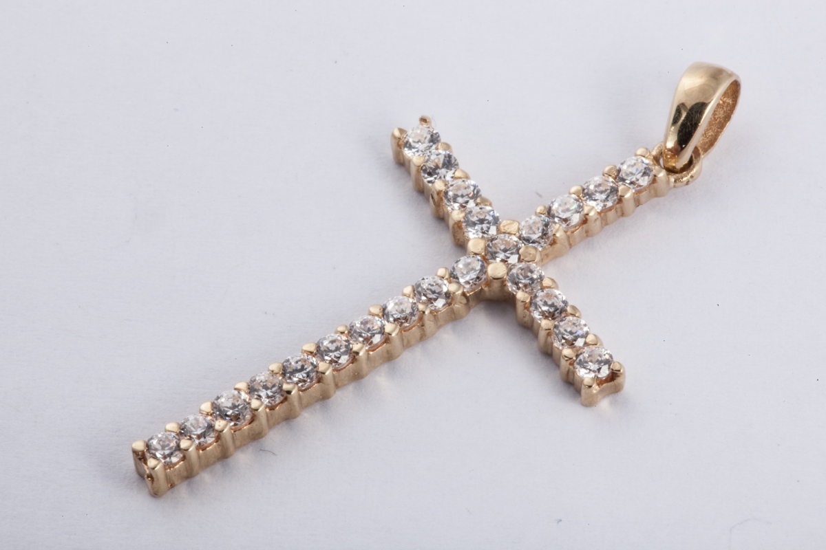 PENDENTIF croix en or jaune, sertie de pierres blanches d'imitation.