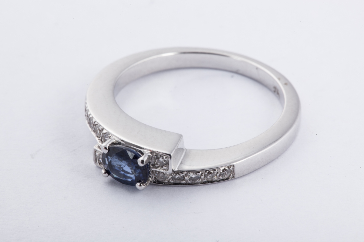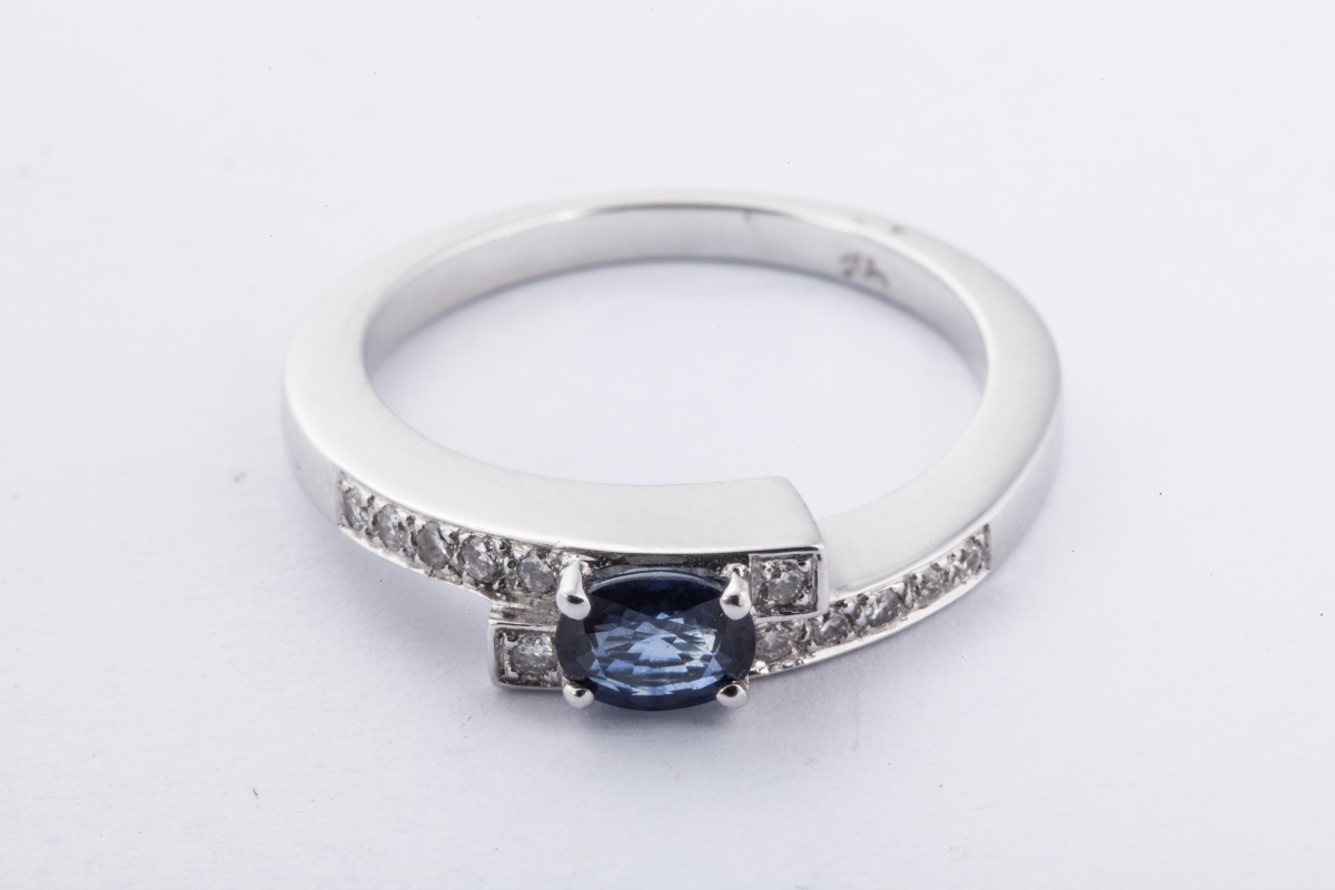 BAGUE croisée en or gris, sertie d'un saphir ovale facetté et de petits brillants.