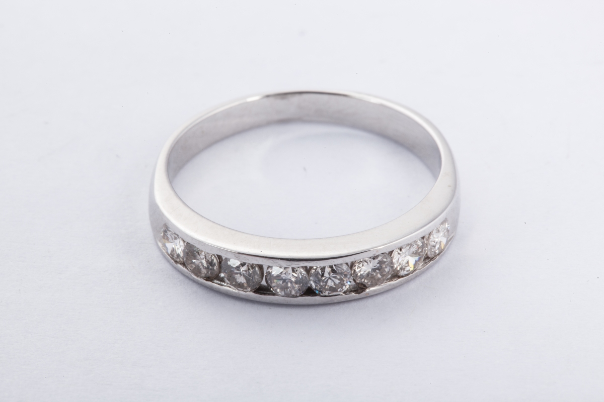 BAGUE rivière en or gris, sertie d'une ligne de petits brillants.