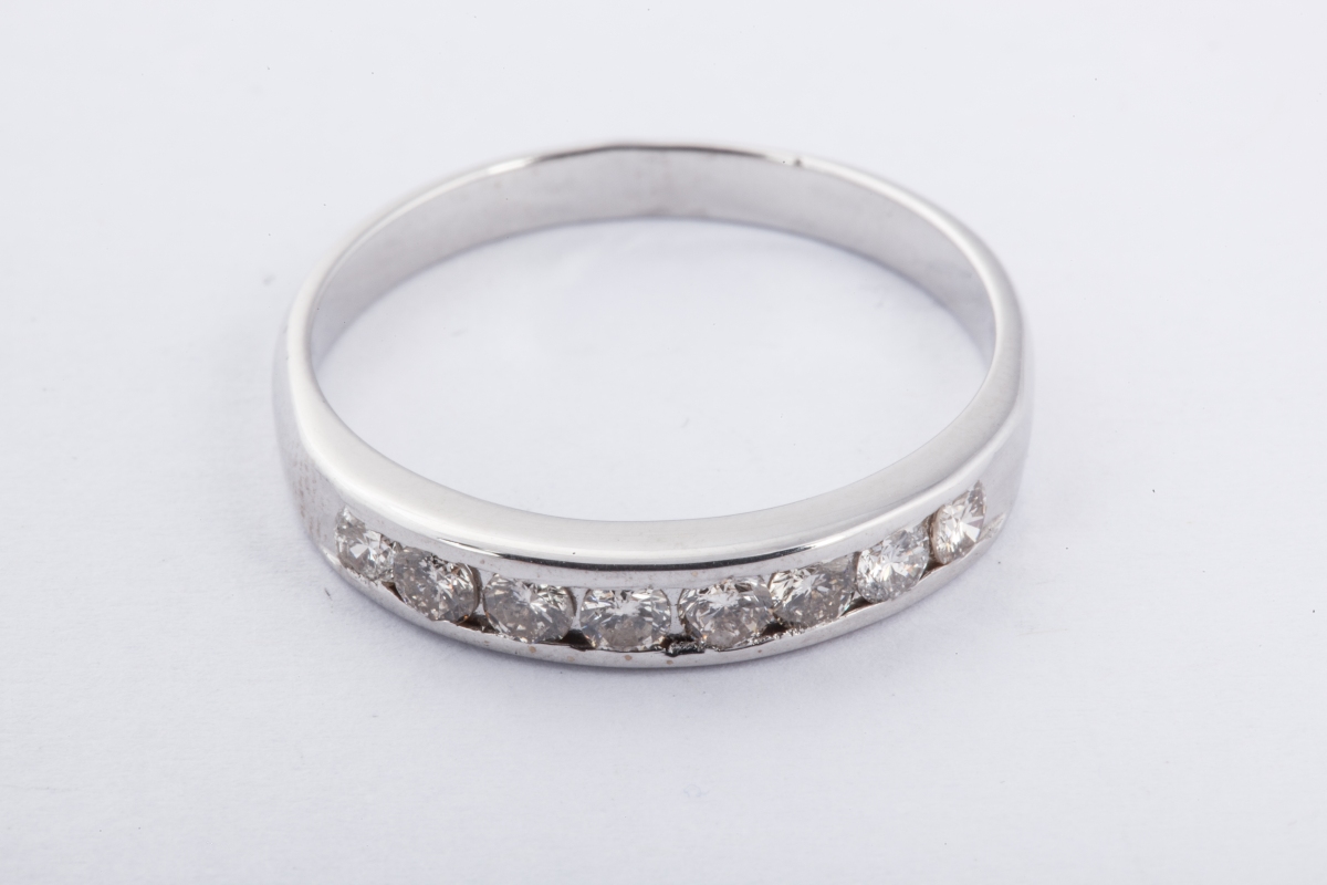 Bague rivière en or gris, sertie d'une ligne de petits brillants.